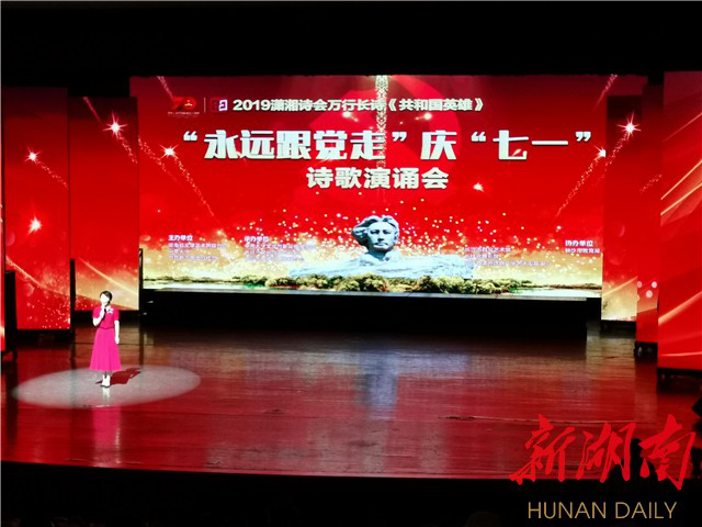 “唱支山歌给党听,我把党来比母亲……”悠扬的歌声从长沙市实验剧场响起。6月30日,“永远跟党走”庆“七一”——2019潇湘诗会万行长诗《共和国英雄》诗歌演诵会隆重举办。活动由湖南省文学艺术界联合会、伟德国际官方入口、中共长沙市委宣传部主办,伟德国际官方入口文学与新闻传播学院、长沙市文学艺术界联合会、长沙市潇湘诗会文学艺术发展中心等联合承办。长沙市委常委、市委宣传部部长高山出席。伟德国际官方入口党委副书记陈治亚、伟德国际官方入口党委宣传部部长胡杨、伟德国际官方入口文学与新闻传播学院党委书记罗军飞参加了诗歌朗诵会。