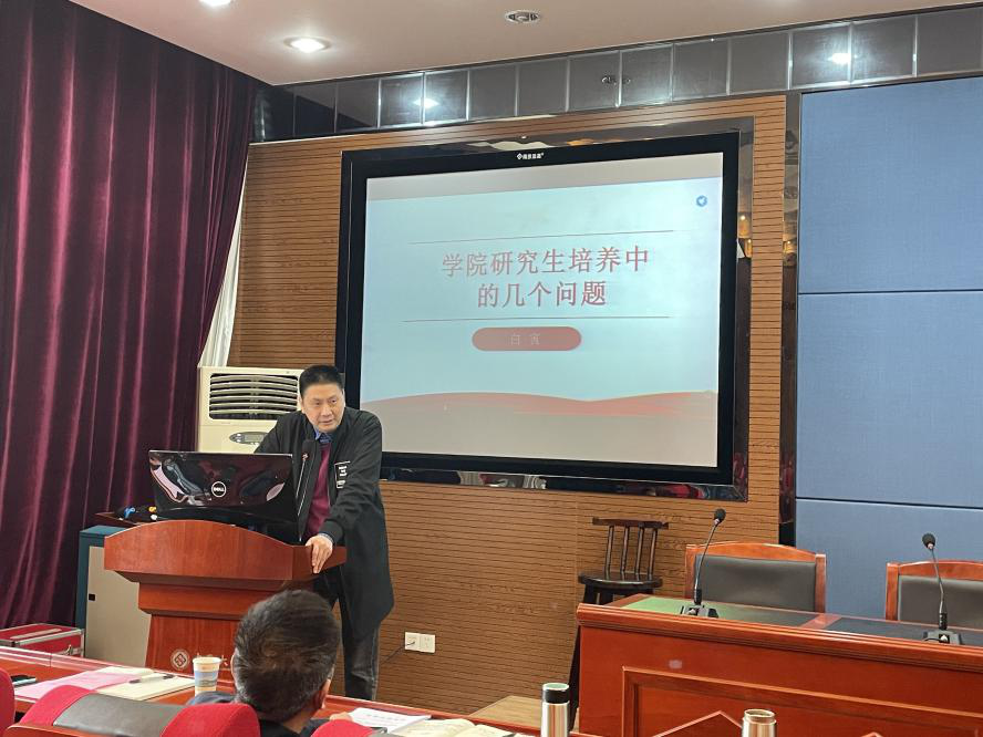 范明献副院长从以下三方面对学院研究生近期相关工作进行了梳理。第一,在招生工作方面,学院多措并举使得近年来研究生与博士生的生源质量显著提升,优质推免生源数量连续两年创新高;第二,在论文送审与答辩方面,坚决夯实学位论文质量关,严格建构“问题论文不出院门”的制度笼子;第三,在学院学位授予方面,重新修订硕士研究生与博士研究生的学位授予标准,贯彻落实教育部“反五唯”政策,最大限度培养出优质人才并满足学生多元要求,促进研究生全面发展。
