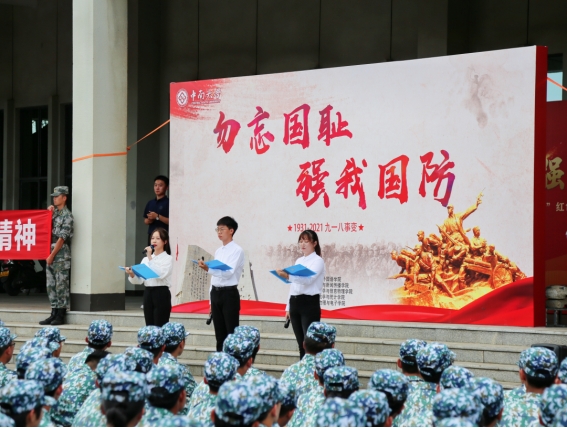 9月17日下午16时20分,伴随着数学院红色故事宣讲团成员的开讲,上千余身着军训服的新生就地落座,跟随者宣讲团成员的深情讲述回顾那一段中华儿女前赴后继、英勇奋斗的历史。我院中国语言文学类2105班王麒珣与来自外语院外国语言学类2106班姜金妹、地信院遥感测绘类2103班比拉力江·艾则孜、物电院电子信息类2103班蔡晓阳组成4人朗诵团,将大家带入那段浓浓硝烟的时光中——“这一天,我的祖国曾遭受凌辱,这一天,我的亲人曾躬身为奴,这一天,我的同胞曾长歌当哭!”,而当同学们沉迷在深刻的悲痛中时,他们又慷慨高声齐诵:“我们挺起胸膛,顽强站立!我们挺起胸膛,振兴中华!”这种从先辈奋斗历史中汲取的自强不息、战胜一切艰难险阻的精神,深深激励着大家前进。