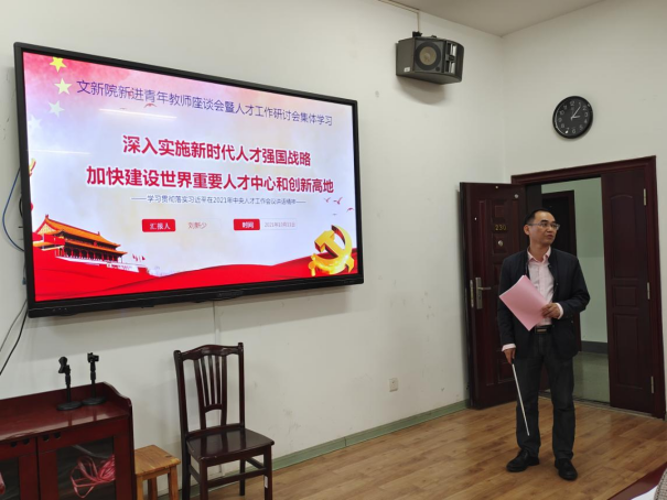 刘新少副院长在会上带领参会者集体学习了习近平在中央人才工作会议上的重要讲话精神。他强调,要深入学习贯彻习近平总书记在会议上的讲话精神,紧跟党和国家对人才工作的指导思想和战略目标,壮大学院人才队伍,重视人才素质培养,形成人才资源优势,有效服务学院和学校各项事业高质量发展。