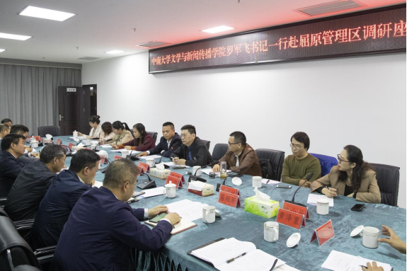 在高素质农民培训中心考察结束后,调研组与屈原管理区相关部门负责人进行座谈。屈原管理区党委委员、宣传部部长韩德辉对屈原宣传、教育、文化等工作情况进行了介绍并希望我院与屈原区在教育上建立深度合作,在文旅融合发展上提供智力支撑,并能为屈原区培养和推送融媒体人才。调研组成员依次发言分享感受与建议。