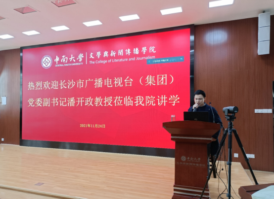 2021年11月24日下午三点,长沙市广播电视台(集团)党委副书记潘开政教授应邀莅临我院进行题为“马克思主义新闻观在新时代的生动实践”主题讲座,介绍新闻媒体应如何在新时代践行马克思主义新闻观。本场讲座由传媒系主任易龙主持,院党委书记罗军飞、副院长刘新少等领导出席。