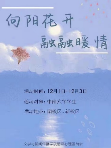 为了让同学们感受冬日中的温暖,丰富同学们的大学生活,文新院心助会举办了“向阳花开,融融暖情”活动。活动采用线下的方式,在繁忙的日子中切实为同学们增添了一份温暖与慰藉。