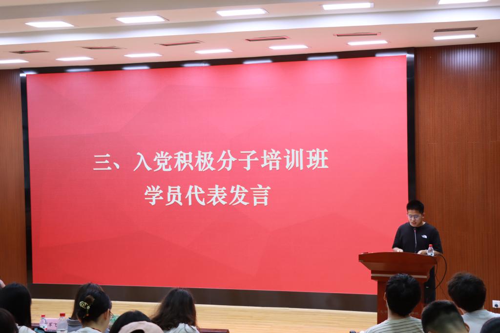 王浩雨同学作为第47期入党积极分子培训班学员代表发言。他提到,党的思想教育和四史教育促进了他对党的建立和发展更深刻的认识。坚信共产主义,加入中国共产党,成为祖国建设先锋队中的一员,是一种信仰,是一种责任,是需要不断追求并为之奋斗的目标。他表示,我们与历史同向同行,与时代同频共振,更应加强思想淬炼,筑牢信仰之基,保质保量完成在培训班的学习,坚定理想,对党忠诚,勤学善悟,脚踏实地,把党的理论作为自身的思想理论武器,将所学所悟践行到日常生活中,不断接受党组织的考验,用青春的能动力和创造力激荡起民族复兴的澎湃浪潮。他呼吁同学们认真对待本次培训,实现思想和理论水平的全面提升,朝着成长为共产主义先锋战士的远大目标而矢志奋斗。