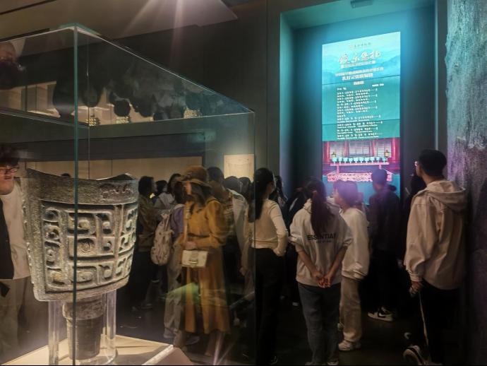 随后,师生们又参观了“湘江北去——长沙古代历史文化陈列”展览。从远古文明的曙光到明清盛衰的变革,同学们从青铜礼器中汲取远古先民的智慧,在玉珩环佩中领略大汉王国的气象,自陶俑瓷器中品味湖湘首邑的繁盛。在屈原、贾谊等文人先驱的塑像前,同学们更是不约而同地背诵起他们的千古名篇以凭吊先贤,充分体现了中文学子深厚的人文情怀和独特气质。