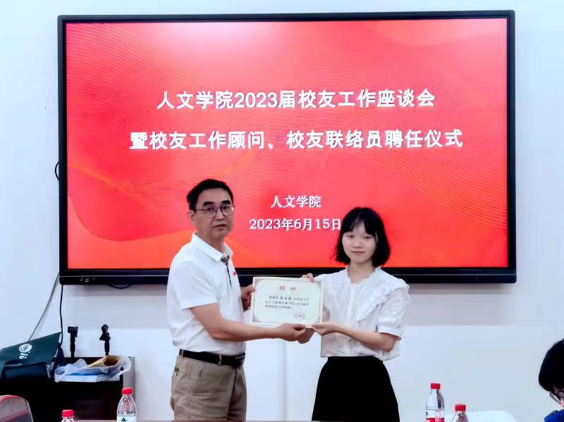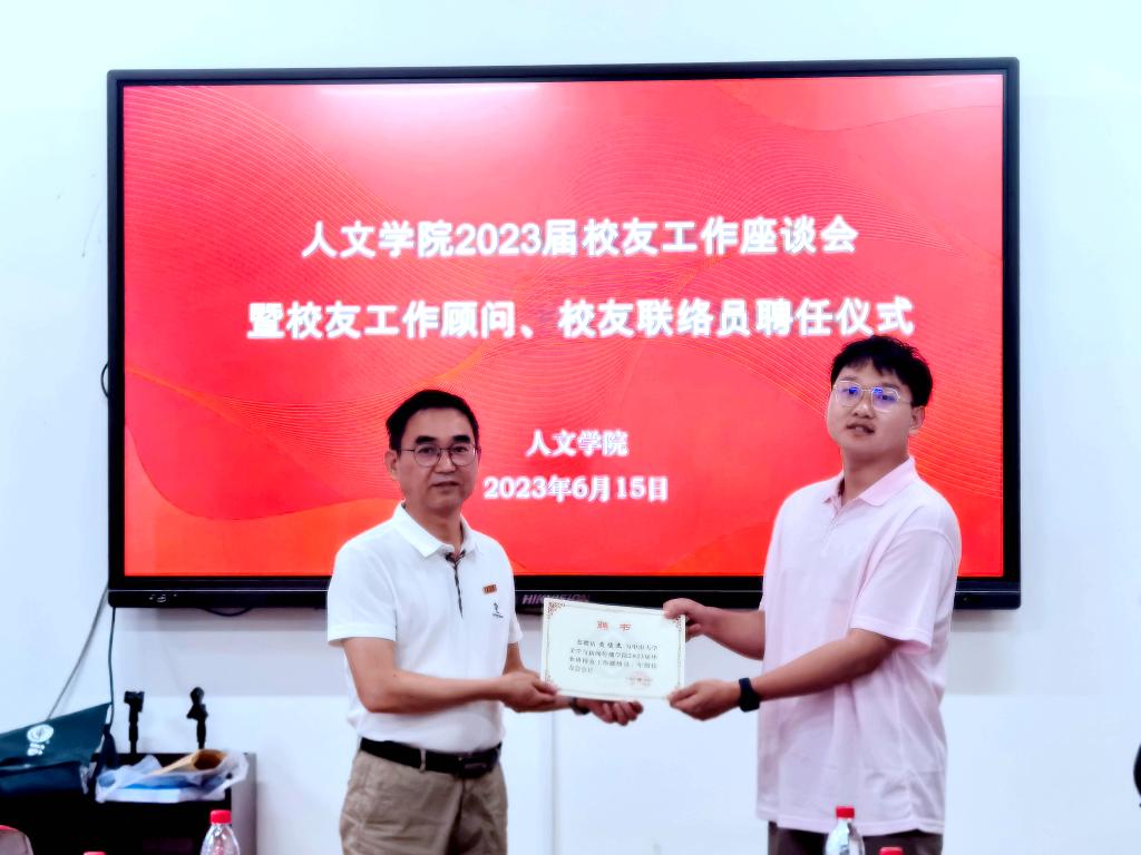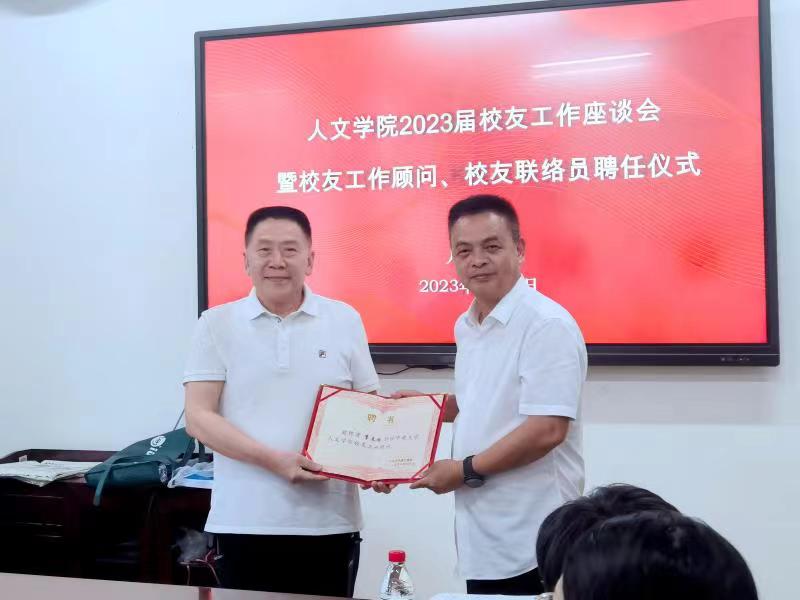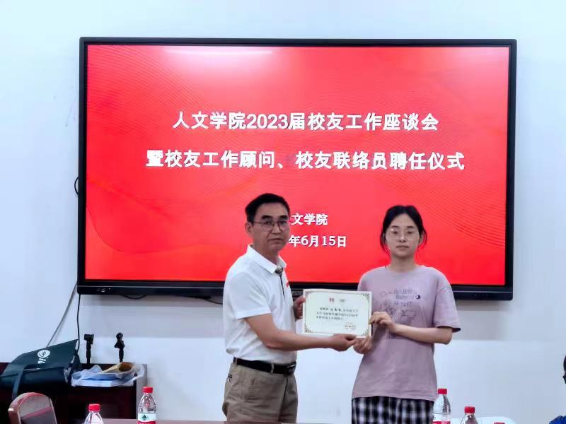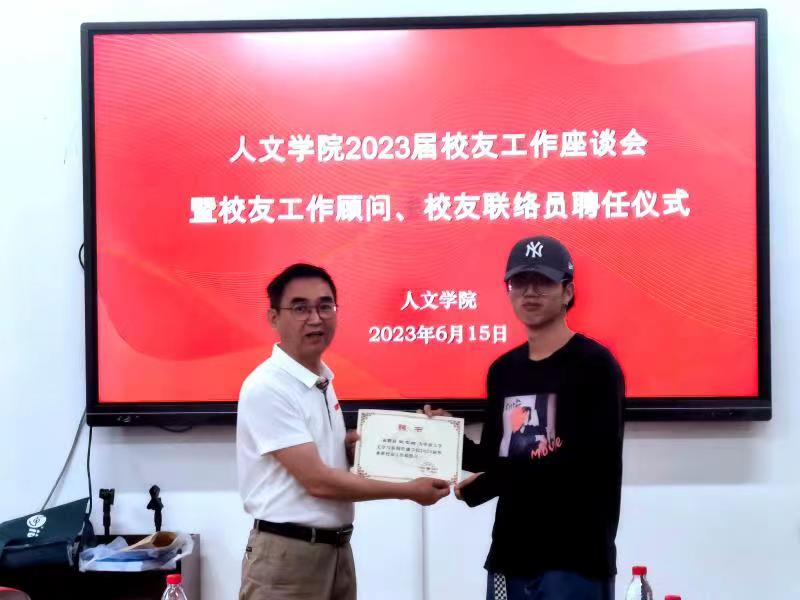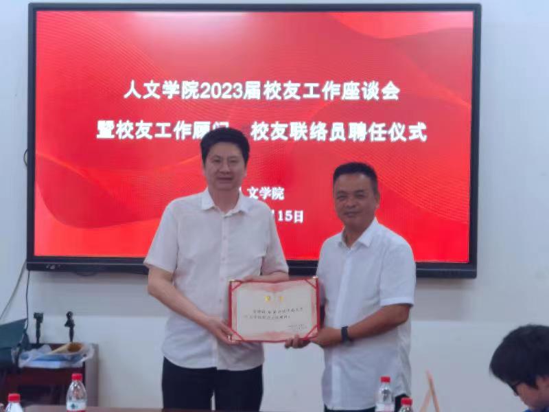 6月15日下午,伟德国际1949官网在文法楼230举行2023届校友工作座谈会暨校友工作顾问、校友联络员聘任仪式,学院党委书记罗军飞、副院长刘新少、校友工作顾问、校友专干杨紫金及校友联络员参加会议。会议由刘新少副院长主持。