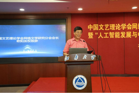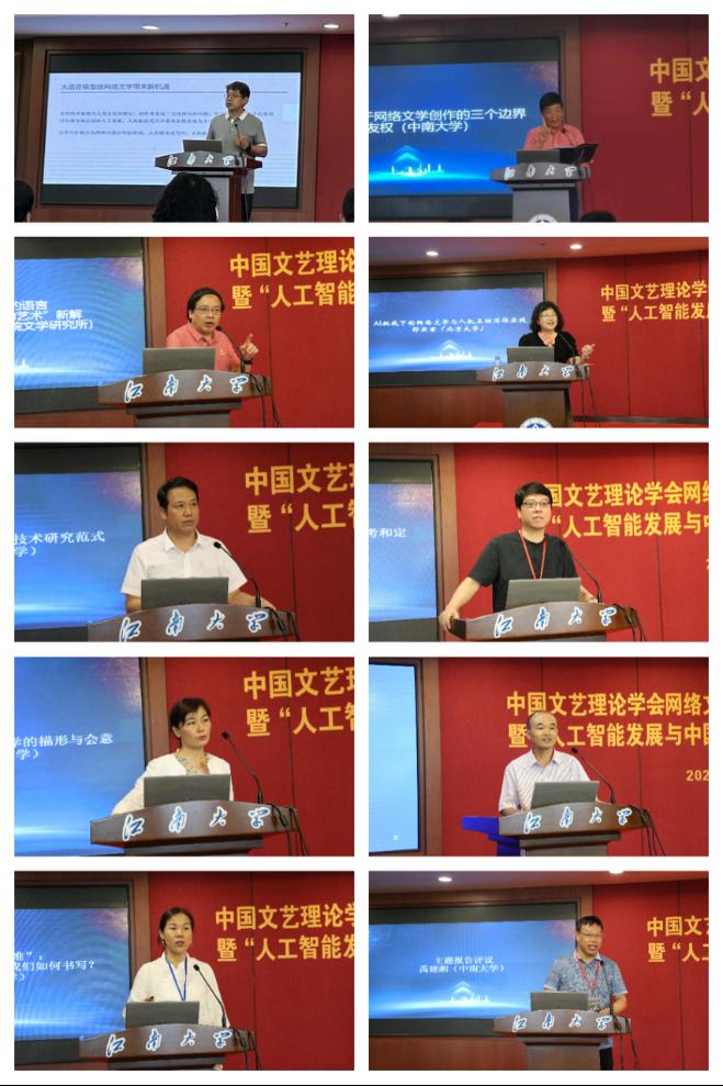 上午大会主题报告环节,九位专家学者依次作报告,主题报告环节由伍红林主持,中国文艺理论学会网络文学研究分会副会长、秘书长禹建湘教授作评议。王峰教授以《人机融合式写作与网络文学新潜能》为题作报告,他认为未来写作将分为人类精英写作与人机融合写作两种方式,并阐述了人机融合写作的三种模式。欧阳友权教授以《ChatGPT之于网络文学创作的三个边界》为题作报告,他认为目前ChatGPT可以完成基本创作,但是无法获得生命体验,共情是网络文学创作的铁门坎,人工智能创作还需厘清三个边界。中国社会科学研究院文学研究所吴子林教授以《文学赖以存在的语言——“文学是语言的艺术”新解》为题作报告,他指出对“文学是语言的艺术”的新解不但可以完成语言从工具论到存在论的转型,还可以开掘汉语在汉语文学中的特殊审美价值。北京大学邵燕君教授以《AI挑战下的网络文学与人机互动写作实践》为题,阐述了人工智能的底层逻辑对文学写作的核心挑战以及人机协作的可能,并以“彩云小梦”为例展示人机交互创作的初步尝试样态。杭州师范大学单小曦教授以《智能化生产:网络文学第三次革命及其技术研究范式的回归》为题,指出网络文学正在经历第三次革命,即网络文学的智能化写作和生产革命,网络文学技术研究范式的兴起、淡化与回归表明网络文学无法脱离技术。杭州师范大学夏烈以《科艺制造:在AI和元宇宙基础上重新思考和定位网络文艺》为题,总结了“数智时代”媒介契机与媒介互动,阐述了人工智能的发展阶段,提出了人工智能之于网络文学需要关注的三个问题。首都师范大学许苗苗教授以《怎样幻想,因何现实:网络文学的描形与会意》为题,分析了网络文学中幻想与现实的关系。江南大学郭勇教授以《网络文学选本编纂与当代文学观念变迁》为题,总结了网络文学选本编纂的三个阶段。江南大学张春梅教授以《未来想象的“后设之维”:当科技/人工智能进入生活,我们如何书写》为题,介绍了人工智能的发展的背景,分三个方面阐述人工智能如何影响文学书写。禹建湘对九位报告人的主旨报告进行了评议,并提出了三点启示:一是网络文学研究从基础的学理辨析、作家研究向更深更前瞻的领域跨进;二是网络文学研究离不开传统文学理论的传承;三是网络文学的快乐性比其研究更加广泛。