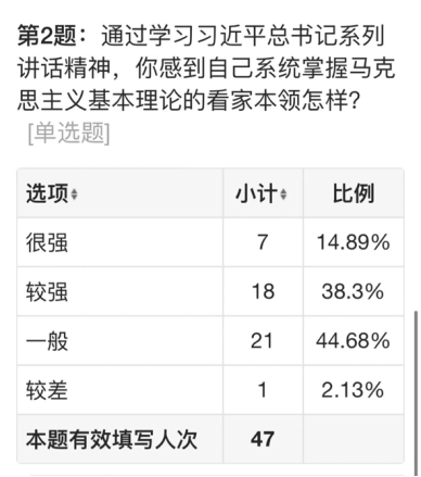 活动开始前,为了调查同学们对于总书记重要讲话精神的掌握情况,团支书们制作了一份关于大学生学习习近平总书记系列讲话精神学情反馈的调查问卷。调查数据显示,大部分同学认为自己对于讲话理论学习得还不够扎实,希望能够进一步学习。