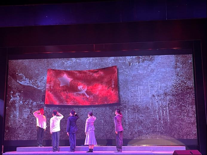 为进一步深入学习国歌故事,体悟国歌精神,学员们在讲解员的带领下来到园区小剧场观看《田汉与国歌》舞台剧。光与影的交错中,田汉先生的一生徐徐展现,国歌的创作过程跃然眼中。学员们站在田汉的视角,领会着在党的领导下,中国人民表现出的不屈不饶的民族精神和冒着敌人炮火前进的民族气节。舞台剧的最后一幕,在场老师与学员纷纷起立与表演者共唱国歌,国歌声在剧场久久回荡,在场所有人心灵触动,热血沸腾,激发出满腔的爱国热情和报国情感!学员杨坤超表示:“今天前往田汉故居进行学习,让我感觉受益匪浅。田汉在革命时期创歌做词的故事让我对《义勇军进行曲》有了新的认识和理解,国歌中的“起来”和“前进”是先辈们用血和泪换来的,我们后辈更要继往开来,在党的领导下谱写新的辉煌。”