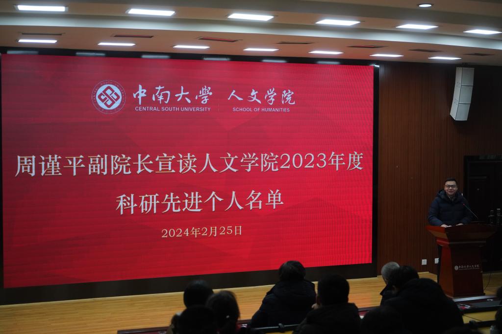 学院党委委员、副院长周谨平宣读了学院2023年度科研先进个人名单,蒋美仕、刘立夫、晏杰雄、聂茂、李熙、习婷、易龙、朱承璋、周灿华、莫甲凤、石雅梅等多位老师获得表彰。