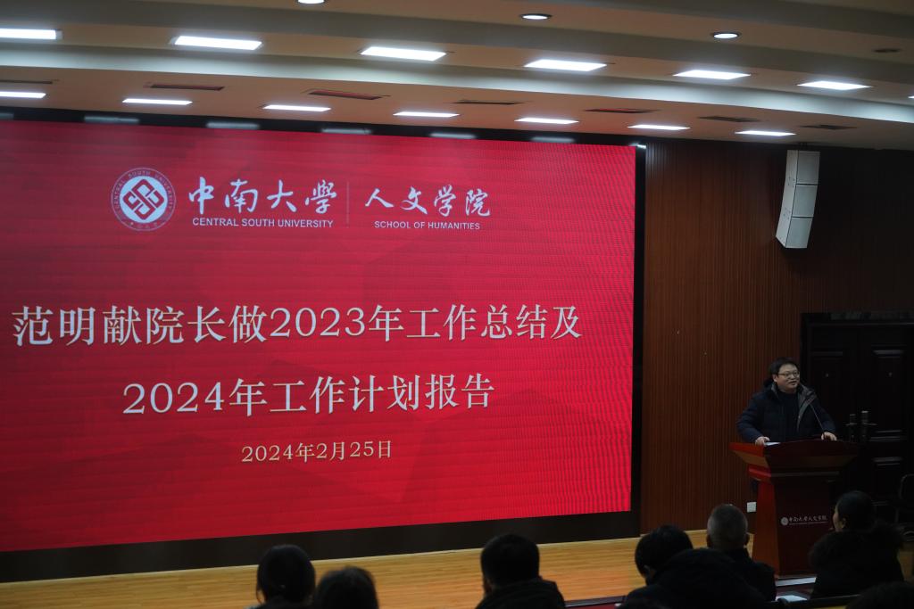 范明献从学科科研、人事行政、本科教学、研究生教学、学生工作等方面总结了学院2023年来取得的成效,他指出,2023年在全院教职工的协同努力下,学院各项工作稳步推进,亮点多多,学科专业建设的四梁八柱进一步夯实做强,形成了学院学科系所协同的工作机制,做成了几件大事,进一步弘扬了“勇于拼搏 敢于胜利”的学院精神。随后,范明献从“工作背景及面临挑战”“工作思路与办学策略”“重点工作”等方面讲解了对于2024年的工作展望,他希望,所有教职工都以高度责任感参与到学院建设中来,为学院贡献一份力量,从工作中感受尊重、幸福、快乐。