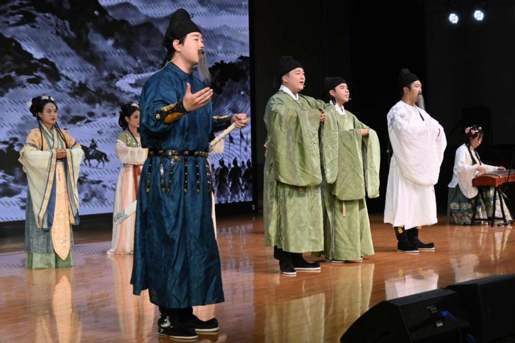 在10月18日的联吟大会中,我校中华经典吟唱团演绎岑参《白雪歌送武判官归京》、李白《将进酒》两首经典作品。同学们以声绘境、以情入诗,既传递出边塞诗风的苍茫壮阔,也抒发出盛唐气象的豪迈激昂,展现了我院学子对古典诗词的深刻理解与艺术表现力。