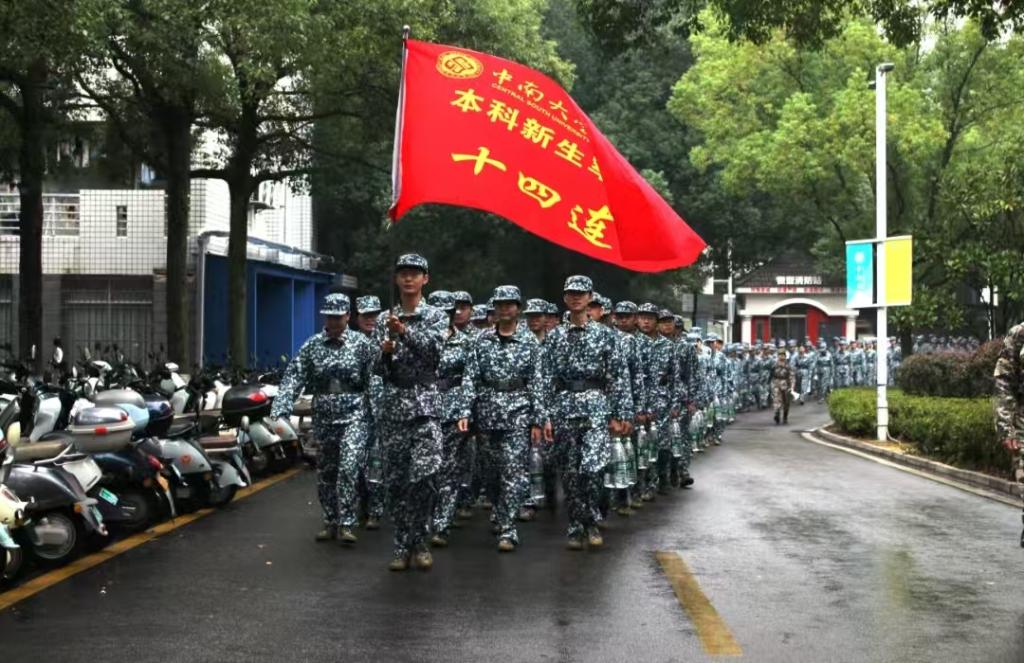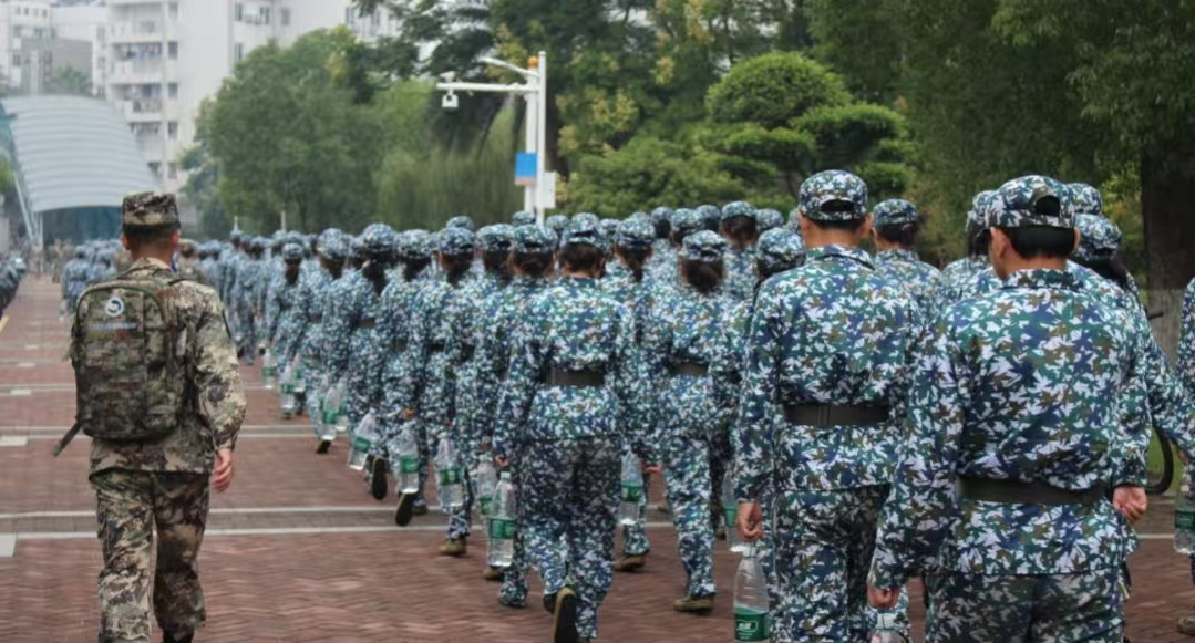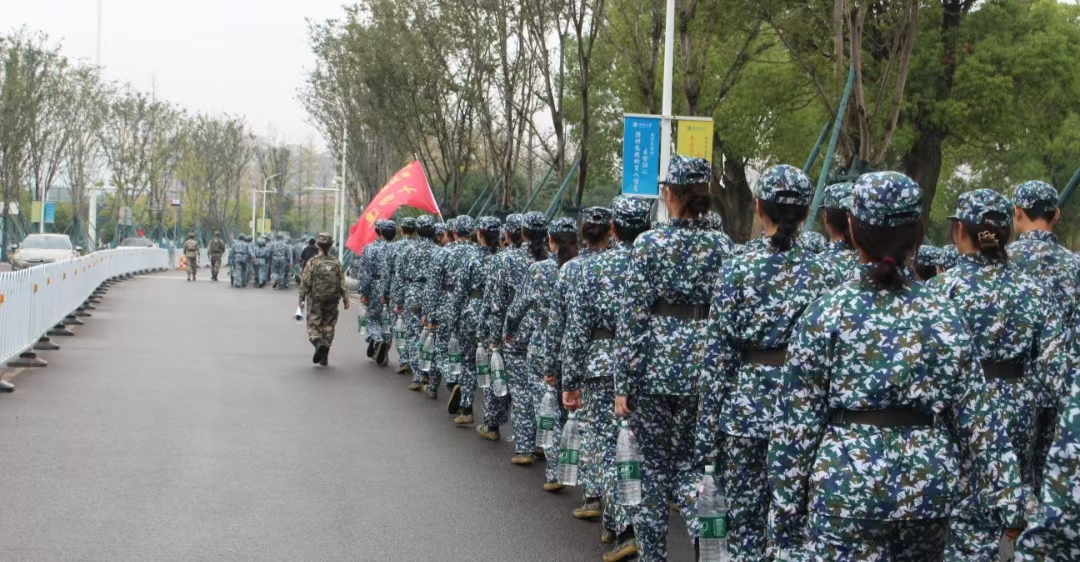 随后,拉练正式开始。鲜红的十四连连旗在队伍前方猎猎作响,新生们在各排长的带领下,呈连纵队沿着马路进发。同学们身着迷彩军装,步履铿锵,挺拔如松,响亮的呼号声在校园道路上回荡。尽管天气寒冷,同学们也毫无惧色,在体力与意志的双重磨砺中完成了青春的蜕变。